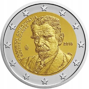 Opis: Motywem jest wizerunek greckiego poety Kostisa Palamasa (1859–1943). Z lewej strony przy otoku biegną półkoliście w dwóch rzędach napisy w języku greckim: „ΕΛΛΗΝΙΚΗ ΔΗΜΟΚΡΑΤΙΑ” (Republika Grecka) i „ΚΩΣΤΗΣ ΠΑΛΑΜΑΣ” (Kostis Palamas). W tle wybito palmetę (znak mennicy greckiej) i rok emisji „2018”. W prawej dolnej ćwiartce znajduje się monogram projektanta Georgiosa Stamatopoulosa. W otoku monety widnieje 12 gwiazd Unii Europejskiej.