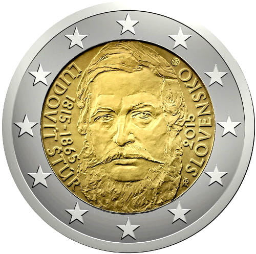 Opis: Moneta przedstawia portret językoznawcy i działacza narodowego Ľudovíta Štúra. Z obu stron portretu umieszczone są w dwóch rzędach napisy: po prawej stronie przy otoku nazwa kraju emisji „SLOVENSKO” (Słowacja), bliżej środka rok emisji „2015”; po lewej stronie przy otoku „ĽUDOVÍT ŠTÚR”, bliżej środka lata życia Štúra „1815–1856”. Po prawej stronie nad napisem znajduje się znak mennicy w Kremnicy: litery „MK” między dwoma stemplami, a pod napisem umieszczono monogram projektanta monety Ivana Řeháka: stylizowane litery „IŘ”. W otoku monety widnieje 12 gwiazd Unii Europejskiej.