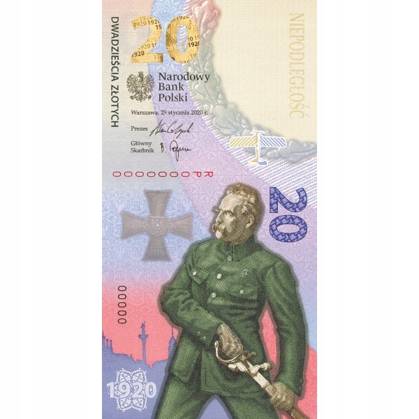 Przednia strona: Na przedniej stronie banknotu przedstawiono postać Józefa Piłsudskiego. Wizerunek został zaczerpnięty z obrazu Kazimierza Mańkowskiego pt. „Rok 1920”. Naczelnika Państwa ukazano jako obrońcę Warszawy. Na dalszym planie widnieją zarysy charakterystycznych warszawskich budowli. Z kolei zaprezentowany tu awers Krzyża Walecznych – z polskim orłem, napisem „Na polu chwały” i datą 1920 – jest odwołaniem do zbiorowego wysiłku polskiego żołnierza oraz czasu ustanowienia tego odznaczenia w kluczowym momencie zmagań pod Warszawą. Przednią stronę banknotu uzupełniają napis NIEPODLEGŁOŚĆ, wpisany w wieniec z liści dębu, oraz elementy graficzne i motywy roślinne znajdujące się na banknotach marek polskich, w tym wizerunek orła i monogram RP widniejące na banknocie 100 marek polskich z 1919 r.
