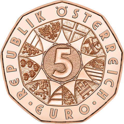 Na awersie znajduje się charakterystyczna dla tej serii kompozycja heraldyczna Republiki Austrii z centralnie umieszczonym nominałem 5 oraz napisem REPUBLIK ÖSTERREICH • EURO. Wielokątny kształt i mozaikowy układ symboli regionalnych podkreślają nowoczesne podejście do klasycznej tematyki państwowej.