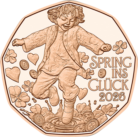 Rewers przedstawia radosne dziecko skaczące po monetach, otoczone symbolami szczęścia – czterolistnymi koniczynami, sercami i motywami dobrobytu. Towarzyszy mu napis SPRING INS GLÜCK 2026 („Skok w szczęście 2026”), jednoznacznie nawiązujący do idei nowego początku i pomyślnego wejścia w nadchodzący rok. Kompozycja jest dynamiczna, pełna ruchu i pozytywnej energii.