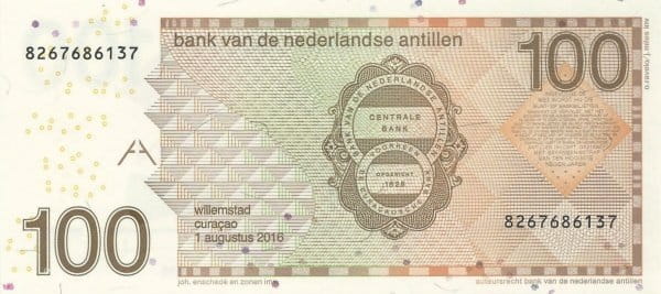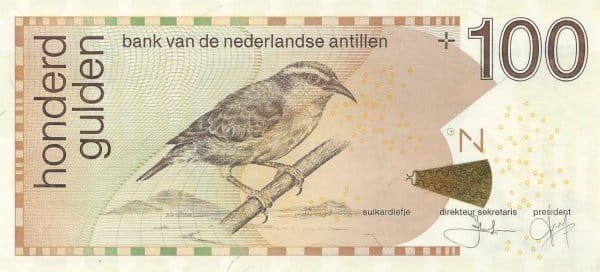 Na przedniej stronie banknotu widnieje wizerunek ptaka – suikerdiefje (ptaszek cukrowy), typowego dla regionu karaibskiego. Po lewej stronie pionowo umieszczony jest napis „honderd gulden”, a w prawym górnym rogu widnieje nominał „100”. Po prawej stronie widoczny jest złoty holograficzny element zabezpieczający w kształcie ogona jaszczurki oraz kierunek północny oznaczony literą „N”.