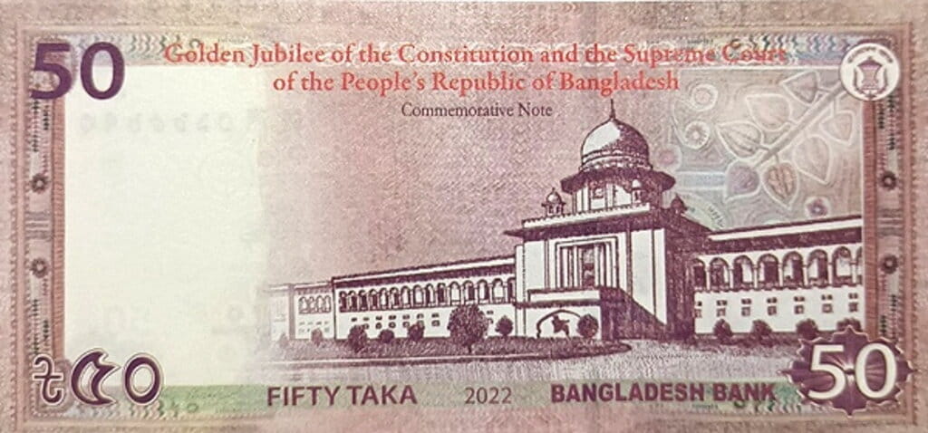 Okolicznościowy banknot 50 taka z 2022 roku został wyemitowany z okazji 50. rocznicy Konstytucji Bangladeszu oraz utworzenia Sądu Najwyższego, co nadaje mu szczególne znaczenie historyczne i symboliczne. Połączenie wizerunku ojca niepodległości z motywem kluczowej instytucji państwowej czyni tę emisję atrakcyjną nie tylko dla kolekcjonerów banknotów azjatyckich, ale również dla osób zainteresowanych historią prawa i państwowości. Jest to banknot, który łączy funkcję obiegową z wyraźnym przekazem rocznicowym i nowoczesną szatą graficzną.