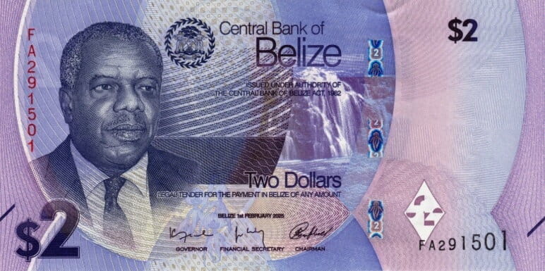 Awers banknotu przedstawia portret Sir Colville’a Younga, wieloletniego gubernatora generalnego Belize (1993–2021), wybitnego pedagoga, pisarza i kompozytora, który zasłynął z działań na rzecz rozwoju kultury i edukacji w kraju. W tle, po prawej stronie, widnieje malowniczy wodospad – symbol bogactwa naturalnego Belize, a całość utrzymana jest w subtelnej palecie odcieni fioletu i błękitu, przywołującej klimat karaibskich wód i lasów tropikalnych. W dolnej części banknotu znajdują się podpisy przedstawicieli Central Bank of Belize, nominał zapisany cyframi i słownie, a także data emisji: 1 February 2025.