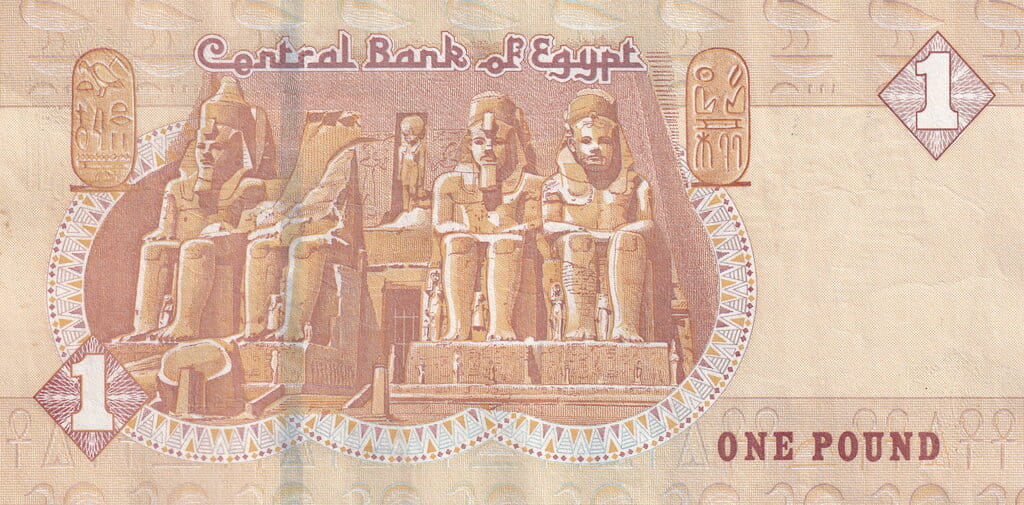Awers banknotu prezentuje monumentalne posągi Ramzesa II z kompleksu świątynnego Abu Simbel – jednego z najbardziej rozpoznawalnych symboli starożytnego Egiptu. Cztery kolosalne figury faraona, wykute w skale Nubii, symbolizują potęgę władzy, ciągłość cywilizacji i tysiącletnie dziedzictwo kulturowe kraju nad Nilem. Kompozycję uzupełniają geometryczne ornamenty oraz subtelne zabezpieczenia graficzne, charakterystyczne dla nowoczesnych emisji Banku Centralnego Egiptu.