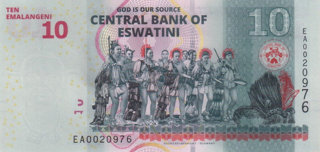 Na rewersie banknotu ukazano grupę tancerzy w tradycyjnych strojach podczas narodowego festiwalu Umhlanga – „Taniec Trzciny”, będącego jednym z najważniejszych wydarzeń kulturalnych w Eswatini. W tle widoczny jest herb Central Bank of Eswatini oraz motto narodowe „God is our source”, podkreślające religijne i duchowe fundamenty kraju.