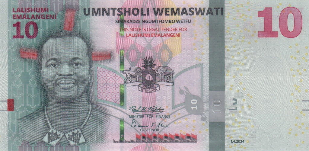 Na awersie banknotu widnieje portret króla Mswatiego III, aktualnego monarchy Eswatini, przedstawionego z charakterystycznym, dostojnym uśmiechem symbolizującym spokój i jedność narodu. Obok niego umieszczono herb państwowy z lwem i słoniem – zwierzętami symbolizującymi władzę i mądrość. Całość kompozycji utrzymana jest w subtelnych odcieniach zieleni i różu, które odzwierciedlają naturalne piękno i bogactwo tego afrykańskiego królestwa.