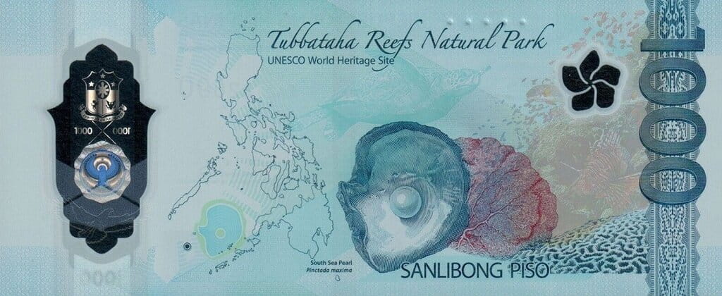 Na rewersie widnieje ilustracja rezerwatu Tubbataha Reefs Natural Park – miejsca wpisanego na listę światowego dziedzictwa UNESCO, znanego z wyjątkowej różnorodności biologicznej i raf koralowych. Obok umieszczono wizerunek perłowej muszli (Pinctada maxima) – odniesienie do bogactwa morskiego dziedzictwa Filipin. Całość dopełniają graficzne motywy tradycyjnego tkania i oznaczenia kierunku geograficznego.