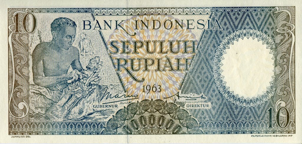 Awers banknotu ukazuje scenę z życia codziennego indonezyjskiej wsi, przedstawiającą rzemieślnika przy pracy, co stanowi wyraźne nawiązanie do tradycyjnych zawodów i rękodzieła będących fundamentem lokalnych społeczności. Kompozycja jest spokojna i realistyczna, utrzymana w stonowanej, zielono-niebieskiej kolorystyce, typowej dla emisji z początku lat 60. Widoczne są charakterystyczne ornamenty giloszowe oraz klasyczny układ typograficzny z nazwą Bank Indonesia i nominałem „Sepuluh Rupiah”.