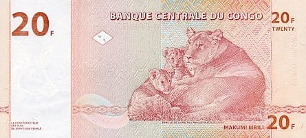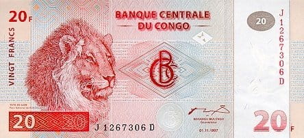 Centralnym motywem awersu jest majestatyczny lew – symbol siły, władzy i dzikiej natury Afryki. Zwierzę ukazane zostało w realistycznej stylistyce, z dużą dbałością o detale grzywy i spojrzenia, co nadaje banknotowi wyrazistości i pewnej monumentalności. W tle widoczne są geometryczne wzory zabezpieczające oraz oznaczenia nominalne „20 FRANCS”, a całość uzupełniają inskrypcje Banque Centrale du Congo i elementy mikrodruku, charakterystyczne dla emisji z końca lat 90.