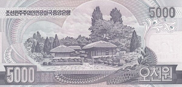 Rewers prezentuje spokojny krajobraz z zabudowaniami o charakterze reprezentacyjnym – niską architekturą otoczoną zielenią, symbolizującą idealizowaną wizję północnokoreańskiej rzeczywistości. Motyw „miasteczka” ma charakter propagandowy, ukazując harmonię, porządek i stabilność państwa. Kompozycję uzupełniają dekoracyjne ramki, roślinne ornamenty oraz powtórzony nominał 5000 wonów, nadające banknotowi klasyczny, niemal medalionowy układ.
