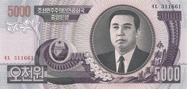 Na awersie banknotu dominuje oficjalny portret Kim Dzong Ila, przedstawionego w formalnym ujęciu, typowym dla północnokoreańskiej stylistyki propagandowej. Wizerunek otacza bogata ornamentyka giloszowa oraz symbole państwowe Koreańskiej Republiki Ludowo-Demokratycznej. Nominał 5000 wonów zapisany jest zarówno cyframi arabskimi, jak i znakami koreańskimi. Całość utrzymano w stonowanej, szaro-fioletowej kolorystyce, podkreślającej powagę i monumentalny charakter emisji. Widoczne napisy urzędowe „조선민주주의인민공화국 중앙은행” (Centralny Bank Koreańskiej Republiki Ludowo-Demokratycznej) jasno identyfikują emitenta.
