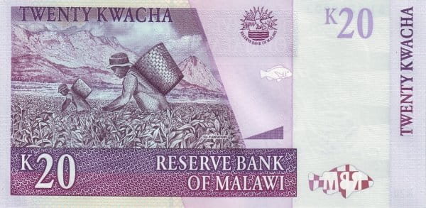Rewers ukazuje scenę zbiorów w wiejskim krajobrazie – kobiety pracujące na polu z koszami na plecach, z majestatycznymi górami w tle. Motyw ten oddaje rolniczy charakter kraju i ukazuje codzienne życie mieszkańców. Całość utrzymana jest w odcieniach fioletu i purpury z delikatnymi pastelowymi akcentami, a elementy zabezpieczające obejmują znak wodny, mikrodruki i nieregularny pasek ochronny z rybim motywem – symbolem związanym z jeziorem Malawi.
