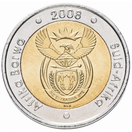 Na awersie monety dominuje oficjalny herb Republiki Południowej Afryki, umieszczony w centralnej części złotego rdzenia. Otok zewnętrzny zawiera napisy „SUID-AFRIKA” oraz „AFRIKA BORWA”, a u góry widoczny jest rok emisji 2008. Dwukolorowa kompozycja podkreśla rangę monety jako emisji obiegowej o charakterze okolicznościowym, łączącej nowoczesną stylistykę z symboliką państwową.