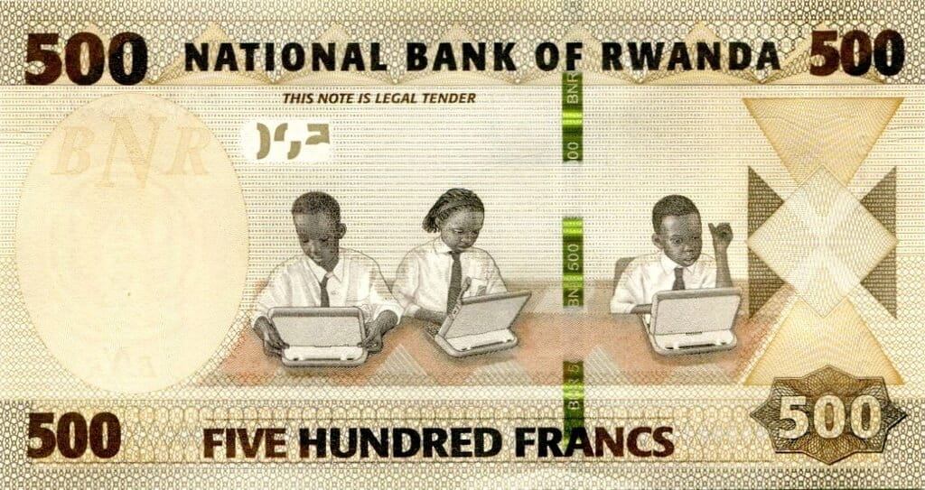 Rewers ukazuje trójkę dzieci uczących się przy laptopach – motyw edukacji i cyfrowej transformacji Rwandy. Scena ta doskonale oddaje ambicję kraju, który dzięki inwestycjom w naukę i technologię stał się jednym z liderów cyfrowego postępu w Afryce.