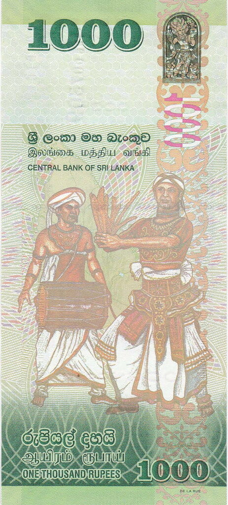 Rewers przedstawia tradycyjnych lankijskich tancerzy w pełnych ceremonialnych strojach. Scena tańca, pełna ekspresji i detalu, nawiązuje do głęboko zakorzenionych rytuałów kulturowych Sri Lanki. W górnej części widnieje ozdobny panel z motywem rzeźbionym, a wertykalne ornamenty tworzą strukturę spójną z całą serią banknotów. Wartość nominalna 1000 rupii jest wyraźnie oznaczona zarówno cyframi, jak i słownie.