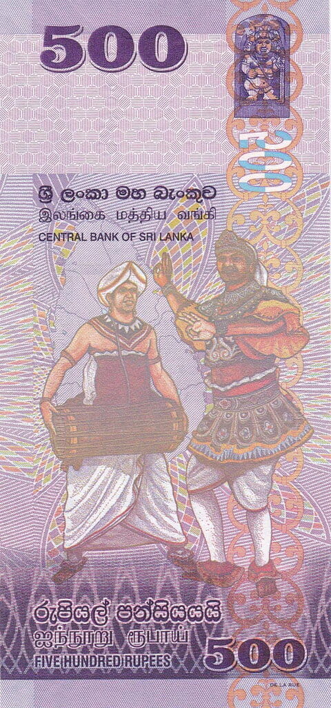 Na awersie banknotu dominuje scena tradycyjnego tańca lankijskiego – energiczny bębniarz oraz tancerz w ceremonialnym stroju przedstawieni są na bogatym tle geometrycznych wzorów, utrzymanych w odcieniach fioletu i pomarańczu. Ich stylizowane sylwetki symbolizują dziedzictwo kulturowe wyspy oraz rolę muzyki w ceremoniach religijnych i świeckich. W górnej części widnieje nominał „500” oraz nazwa emitenta w językach syngaleskim, tamilskim i angielskim. Całość kompozycji zdobi pionowy ornament oraz subtelne zabezpieczenia wplecione w tło.