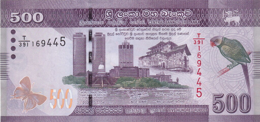 Rewers przedstawia panoramę Kolombo z dominującymi wieżami World Trade Centre – jednym z najbardziej rozpoznawalnych budynków Sri Lanki, będącym symbolem nowoczesności i gospodarczej siły kraju. Obok widoczna jest także siedziba Bank of Ceylon oraz historyczne obiekty związane z dziedzictwem kolonialnym. Prawą stronę banknotu zdobi zielona papuga różanolica, charakterystyczny ptak regionu. Wkomponowane zabezpieczenia, motyle oraz powtarzalne wzory tworzą harmonijną, nowoczesną kompozycję.