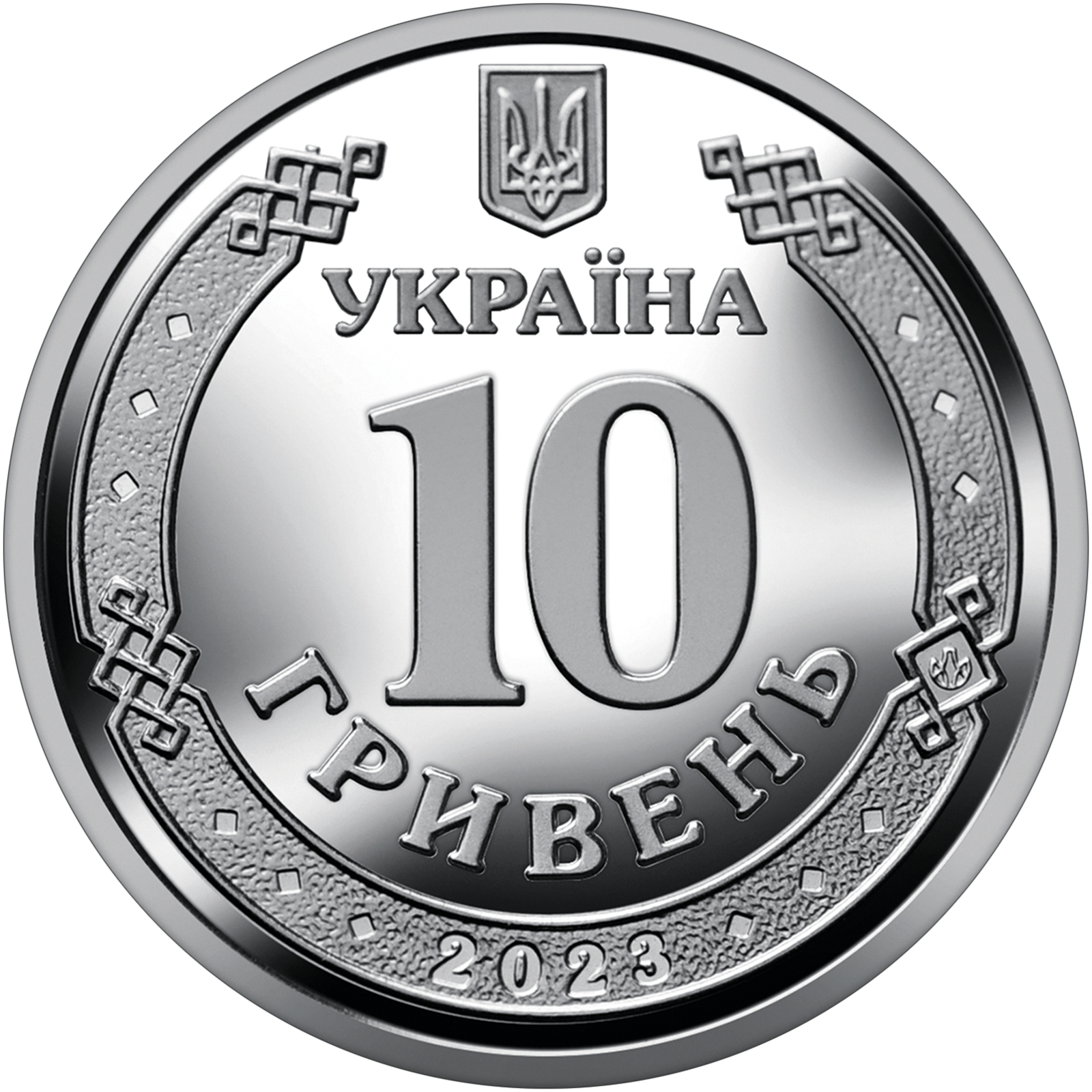 W centrum, w otoczeniu ornamentu nawiązującego do sztuki Rusi Kijowskiej, umieszczono napis: „УКРАЇНА / 10 / ГРИВЕНЬ” (Ukraina / 10 / hrywien).