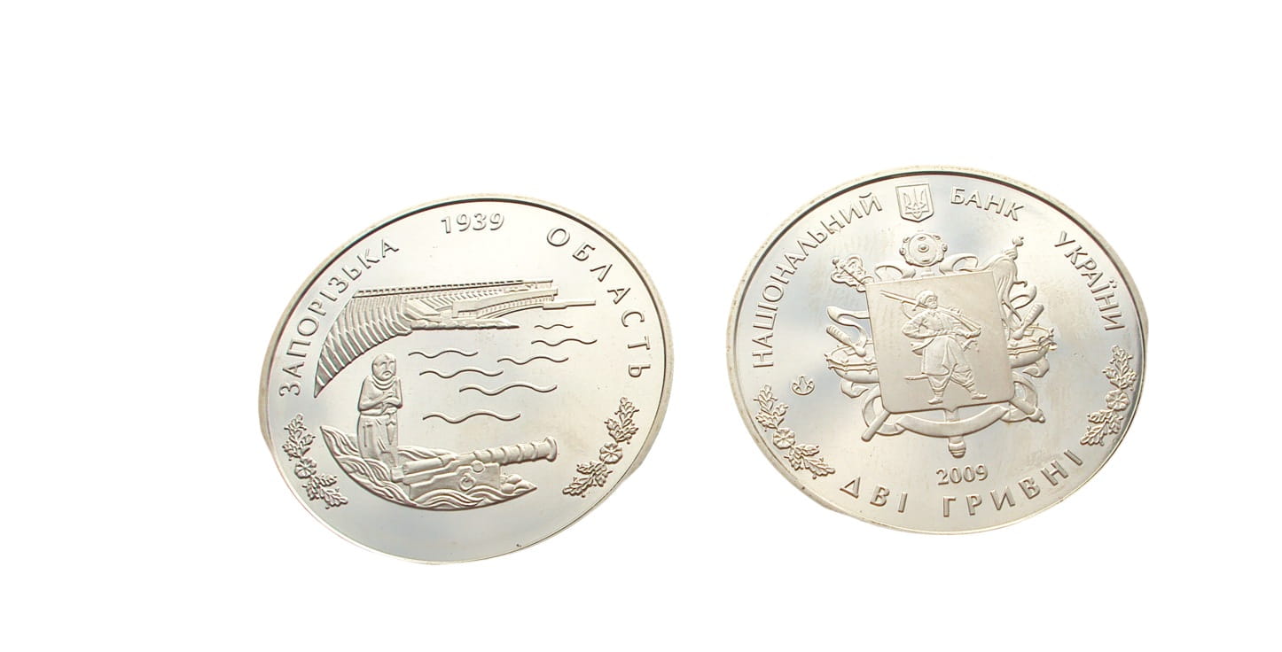 Awers: Herb Okręgu Zaporoskiego, na lewo od niego znak mennicy NBU, a pod spodem rok wydania 2009. Wzdłuż rantu napisy : НАЦІОНАЛЬНИЙ БАНК УКРАЇНИ (przedzielony małym herbem państwowym Ukrainy oraz ozdobnym ornamentem z dębowych liści) oraz nominał monety ДВІ ГРИВНІ.