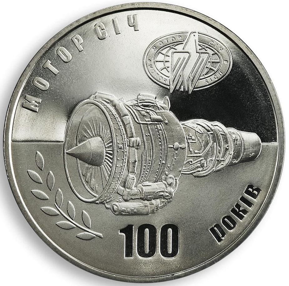 Rewers: Silnik samolotu, nad nim po prawej logo zakładu, wzdłuż rantu napisy: МОТОР СІЧ, 100 РОКІВ.