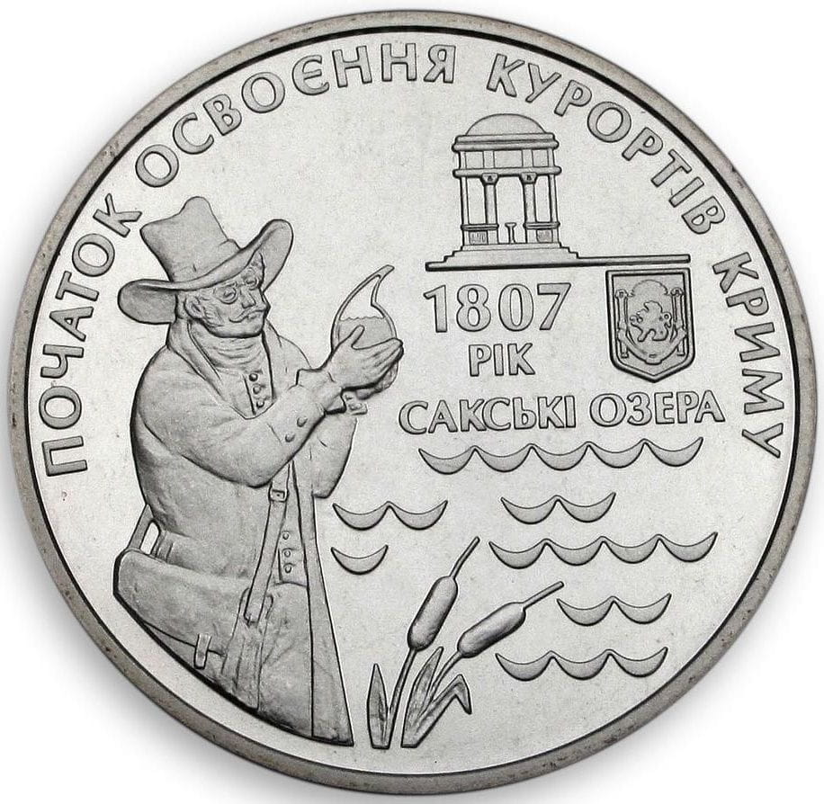 Rewers: Na tle jeziora postać chemika Feliksa De Searr`a, który w 1807 pierwszy przeprowadził analizę błot sackich. Po prawej stronie obok napisu 1807/РІК/САКСЬКІ ОЗЕРА oraz herbu Autonomicznej Republiki Krym wizerunek pijalni wód. Wzdłuż rantu na górze napis ПОЧАТОК ОСВОЄННЯ КУРОРТІВ КРИМУ.
