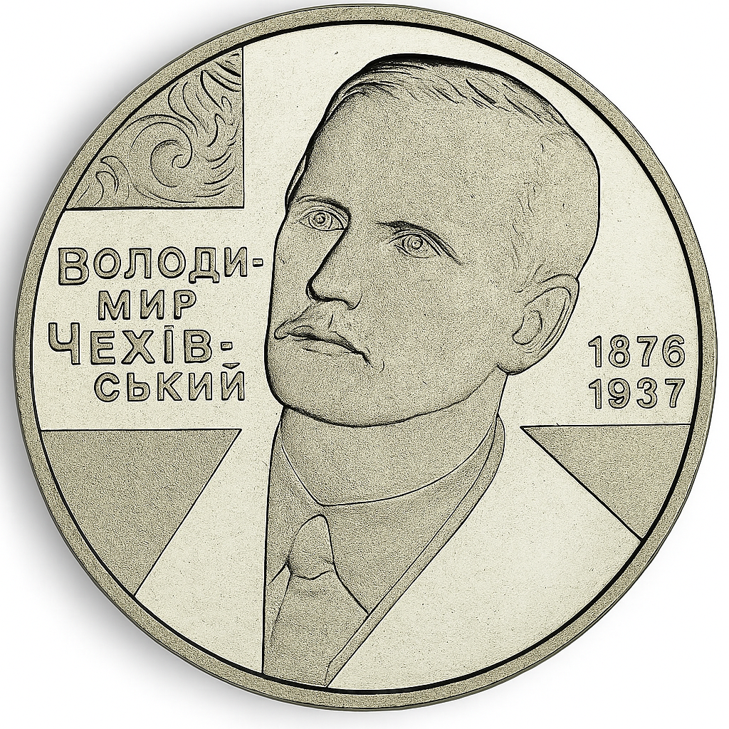 Rewers: portret W. M. Czechowskiego na tle stylizowanego krzyża oraz napisy ВОЛОДИ-/ МИР/ ЧЕХІВ-/ СЬКИЙ і lata życia - 1876/ 1937.