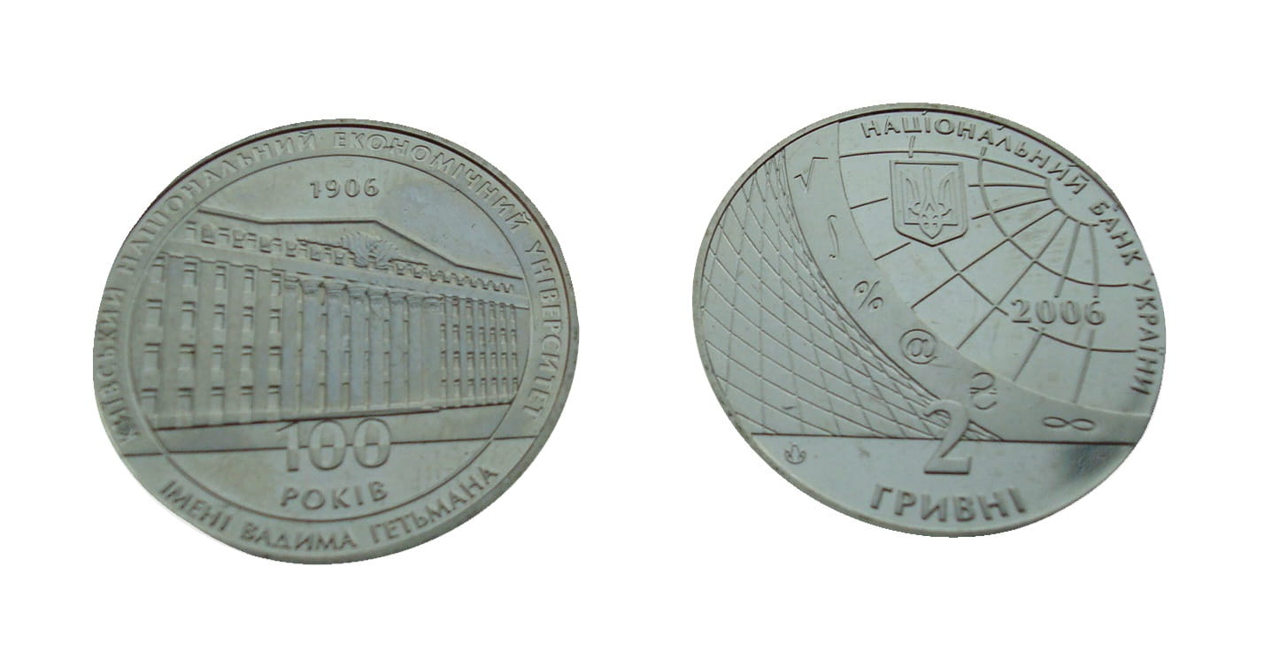 Opis: Moneta poświęcona 100. rocznicy powstania Państwowego Uniwersytetu Ekonomicznego im. W. Hetmana w Kijowie. Uczelnia powstała na bazie kursów ekonomicznych, założonych w Kijowie w 1906 roku. Bogate doświadczenie i potencjał twórczy pozwoliły uczelni stać się liderem przekształcania się szkół wyższych i nauk uniwersyteckich w warunkach formowania się niezależnej Ukrainy i tworzenia się wolnego rynku w ekonomice ukraińskiej.