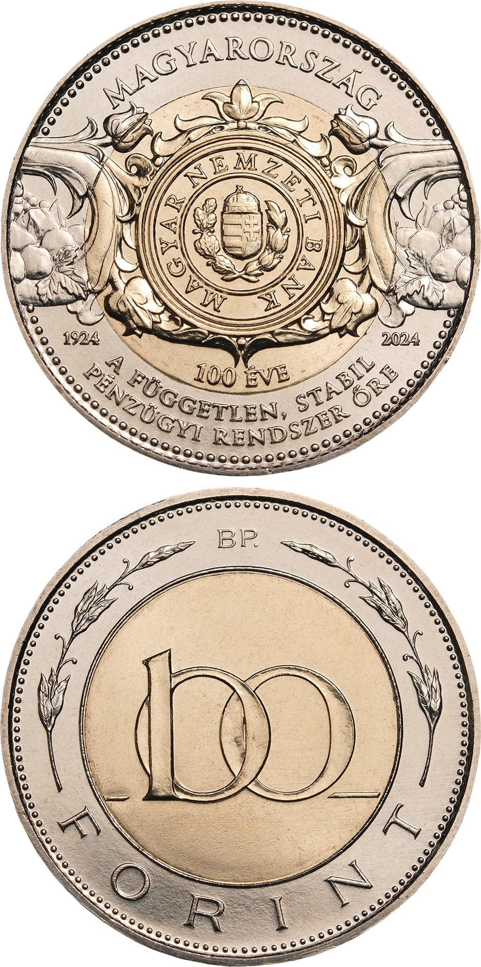 Okolicznościowa moneta wybita przez Magyar Nemzeti Bank (MNB) z okazji setnej rocznicy powstania Banku Centralnego Węgier, który od 1924 roku stoi na straży stabilności finansowej i rozwoju gospodarczego kraju.