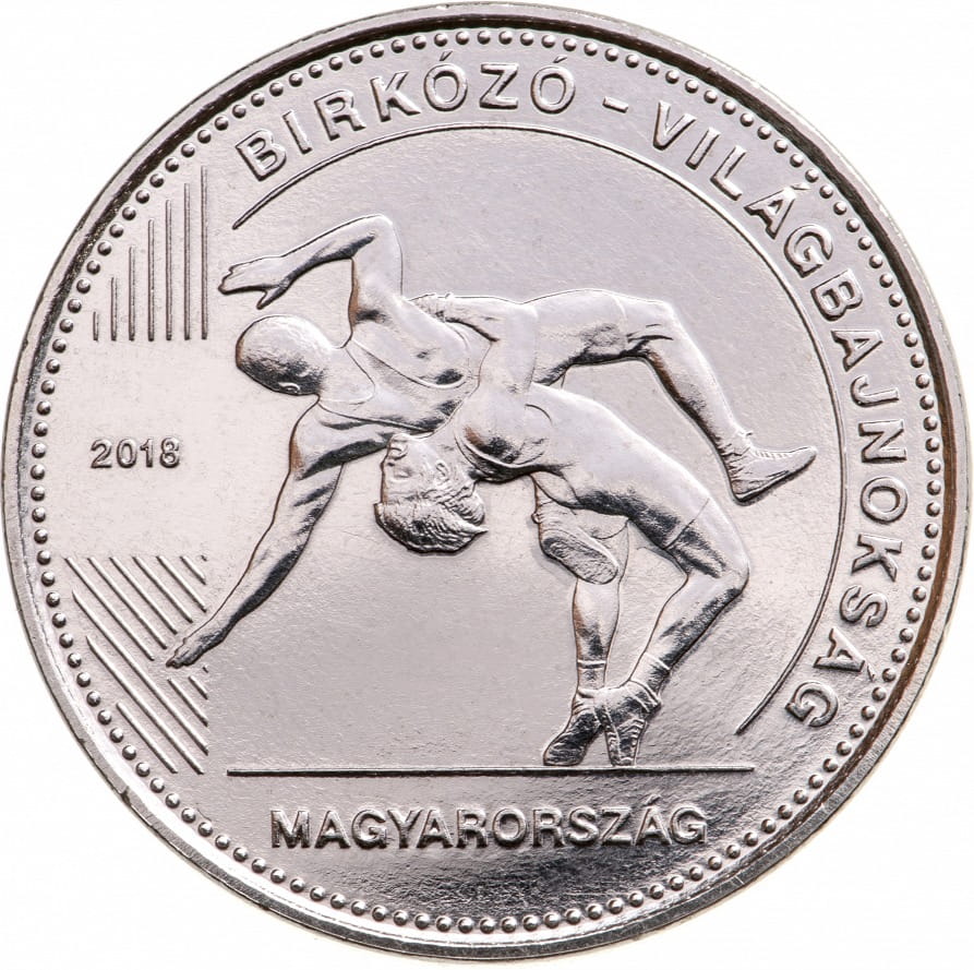 Rewers przedstawia dynamiczną scenę walki zapaśniczej – dwóch zawodników uchwyconych w kluczowym momencie rzutu. Motyw ten symbolizuje zapasy jako jedną z najważniejszych i najbardziej utytułowanych dyscyplin sportowych na Węgrzech. W otoku umieszczono napis „BIRKÓZÓ – VILÁGBAJNOKSÁG” (Zapasy – Mistrzostwa Świata), nazwę kraju „MAGYARORSZÁG” oraz rok emisji 2018. Całość charakteryzuje się wysoką plastyką reliefu i wyraźnym ruchem postaci.
