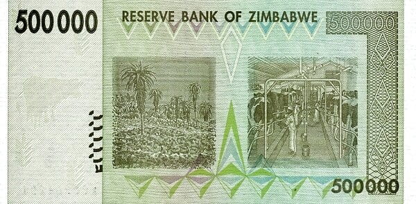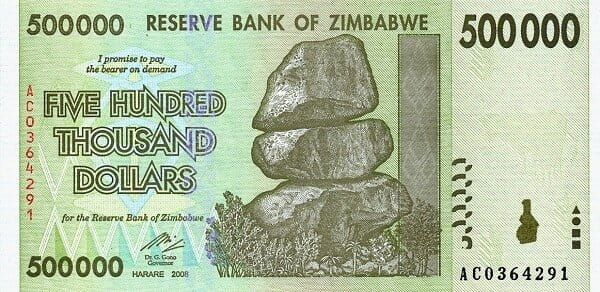 Na awersie banknotu dominuje charakterystyczny dla serii hiperinflacyjnej wizerunek formacji skalnej Hiremba – symbolu stabilności i ciągłości w kulturze Zimbabwe, zestawiony ironicznie z realiami gwałtownie tracącej wartość waluty. Nominał Five Hundred Thousand Dollars został wyeksponowany wielokrotnie, a całość utrzymano w zielono-oliwkowej kolorystyce typowej dla emisji Reserve Bank of Zimbabwe z 2008 roku. Widoczne są także drobne elementy zabezpieczające i podpis gubernatora banku centralnego.